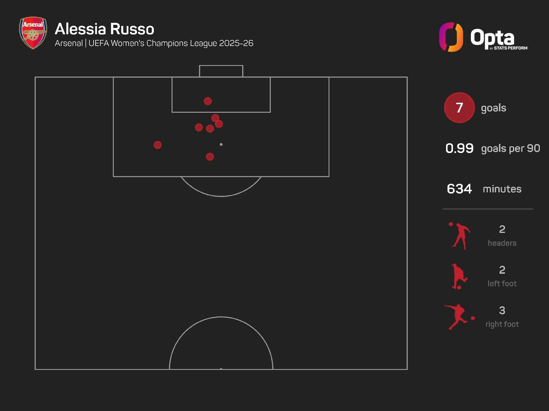 إنها ثالث لاعبة فقط خلال المواسم الخمسة الماضية تسجل هدفين على الأقل برأسها (هدفين)، وقدمها اليمنى (ثلاثة أهداف)، وقدمها اليسرى (هدفين)، بعد كاديدياتو دياني في موسم 2023-2024 وماري أنطوانيت كاتوتو في موسم 2021-2022.